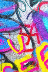 Multicolor graffiti - blue, pink, yellow, red, black spray paint on rough textured wall. Urban Y2K style street art culture, paint mural, grungy background, 90s poster, creative banner, summer visuals