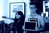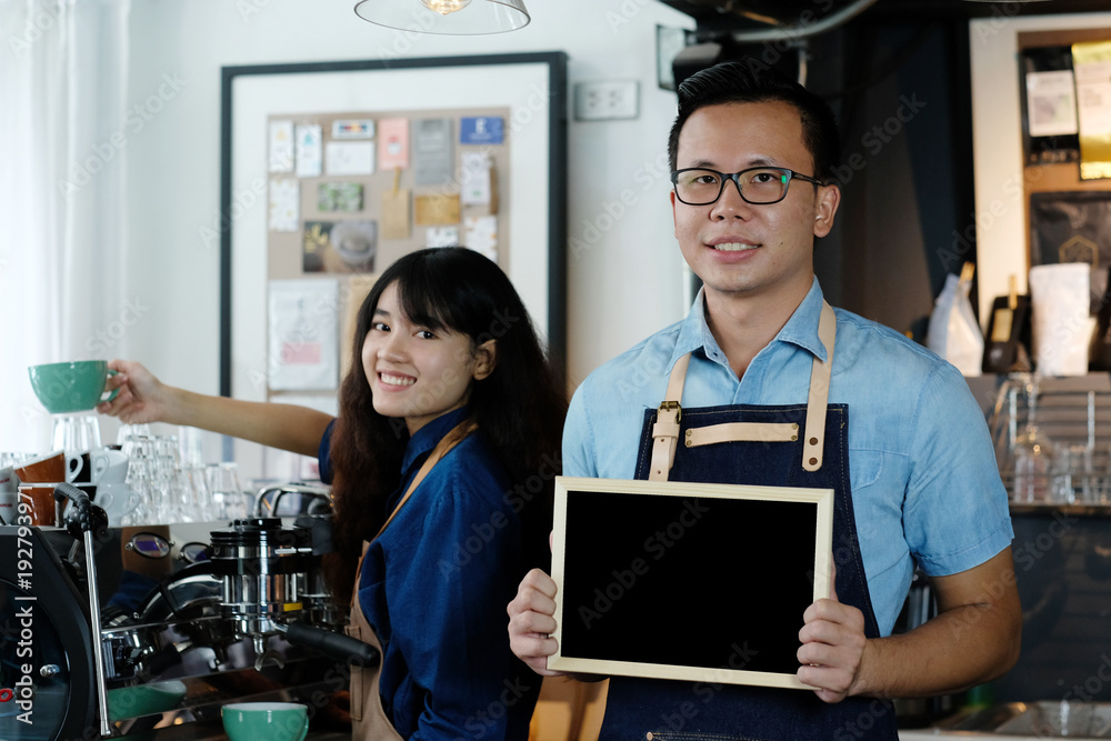Young asian barista holding blank chalkboard with smiling face at cafe counter background, food and drink concept