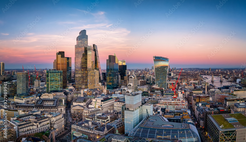 Aerial view of the City of London, UK, skyline from Bank until Tower Bridge with office skyscrapers reflecting the sunlight during sunset