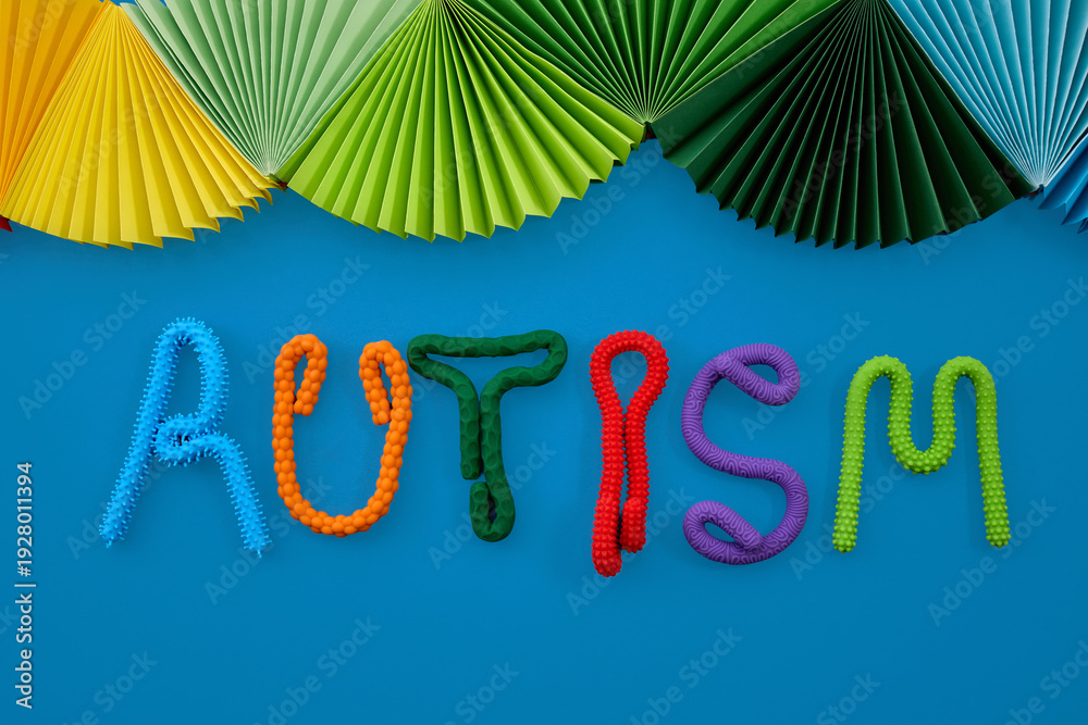 Colorful autism spectrum awareness word with sensory toys
