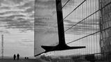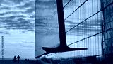 Winter sunset view with people silhouettes against the modern glass wall.