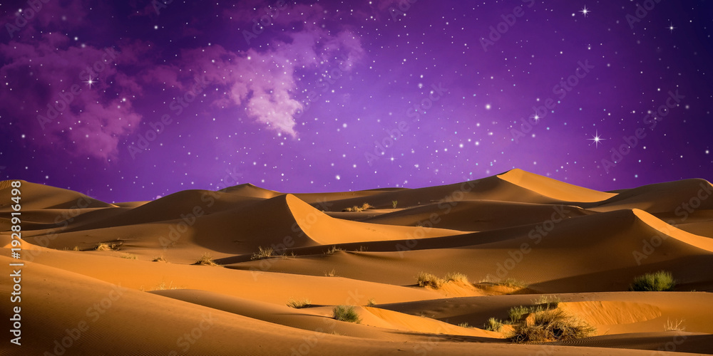 night landscape with desert dunes, starry sky and milky way in desert, abstract background.
