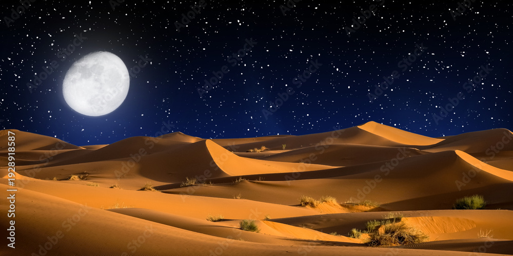 night landscape with desert dunes, starry sky and milky way in desert, abstract background.