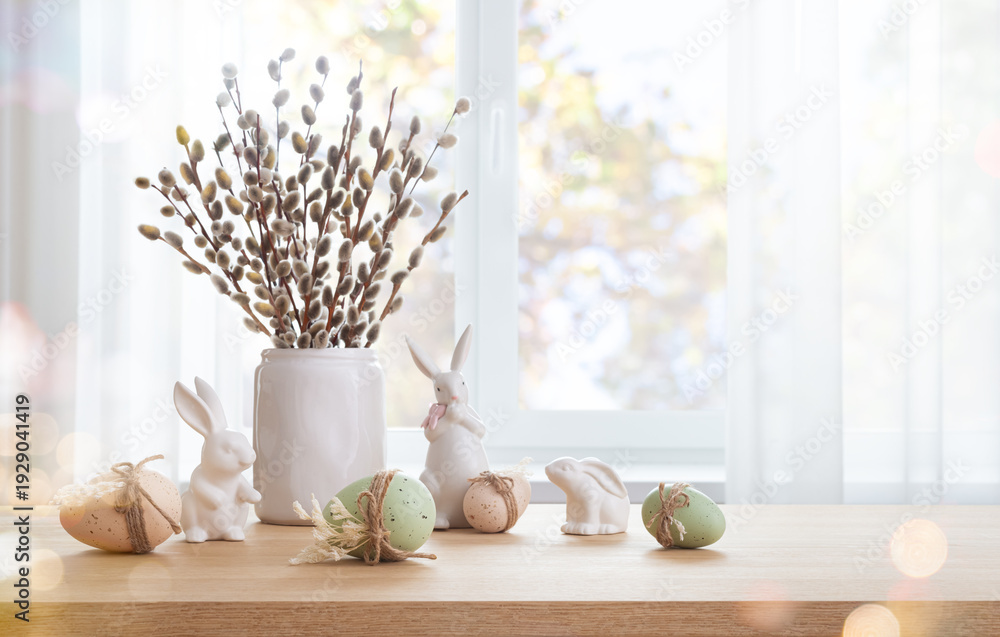 Easter eggs tied to dry branches arranged on wooden table along with bunny figurines and vase filled with willow