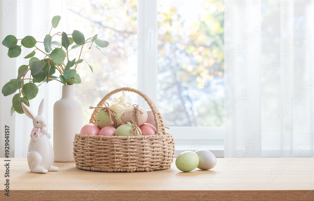 Painted Easter eggs and bunny figurine on wooden table over window interior background