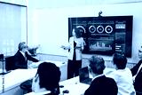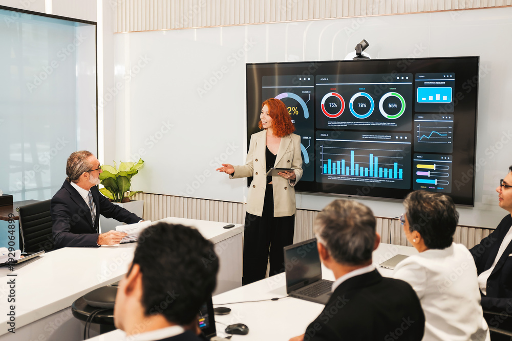 Executives in a boardroom watch a presenter explain performance dashboards on a large screen, discussing metrics and strategy during a corporate meeting.