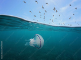 Mediterranean gulls flying in the sky with a barrel jellyfish underwater, split view above and below water surface, Spain, Costa Brava, Catalonia, Girona