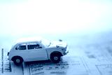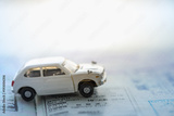Transport and Travel Concept. Close up of vintage mini car toy model on passport with immigration stamps.