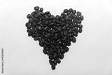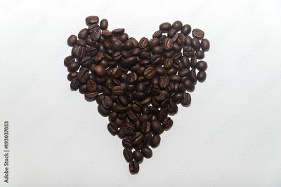 Elegant heart made of grains of roasted fragrant coffee on a white background
