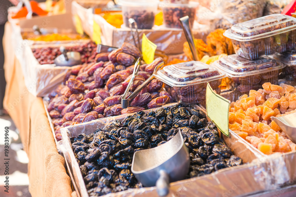 Close up assorted dried fruits and berries on market place in Tel Aviv, Israel. Selective focus, space for text.