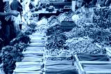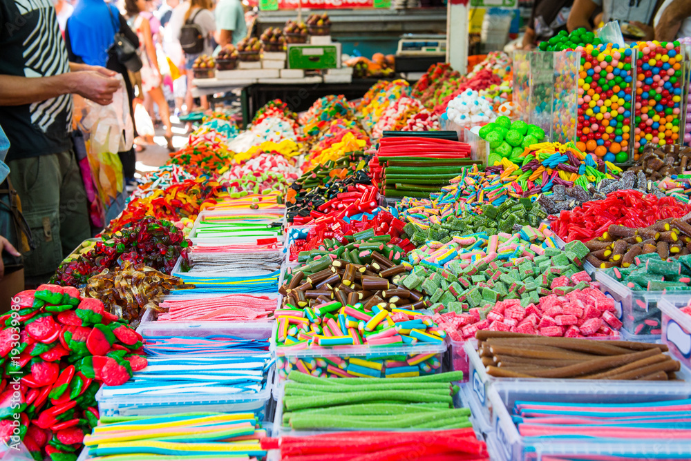 Customers choose sweets from counter with assorted colorful different shape jelly candies on market place in Tel Aviv, Israel. Selective focus, space for text.