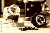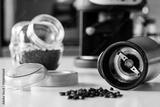 Morning coffee in the kitchen. Coffee grinder and coffee maker with coffee makers on a white kitchen table.