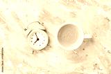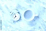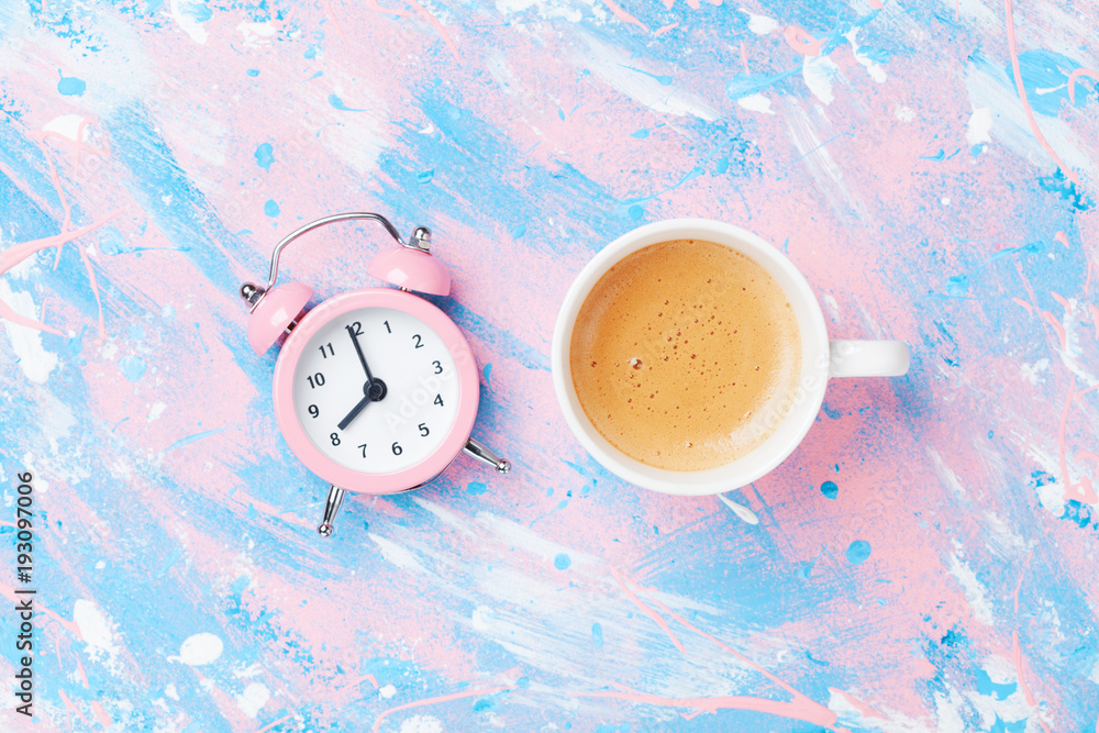 Morning cup of coffee and alarm clock on colorful working desk top view in flat lay style. Punchy pastel background.