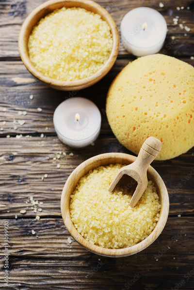 Concept of spa therapy and wellness with yellow salt and candles