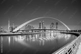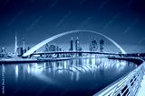 DUBAI, UAE - FEBRUARY 2018: Colorful sunset over Dubai Downtown skyscrapers and the newly built Tolerance bridge as viewed from the Dubai water canal.