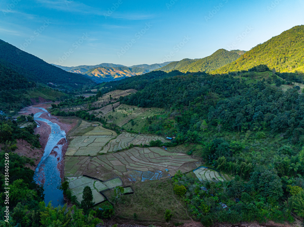 A picturesque rural landscape featuring green rice terraces, fertile farmland, and a small village nestled among lush hills and natural waterways. Dawn Horizon in Motion A Mountain