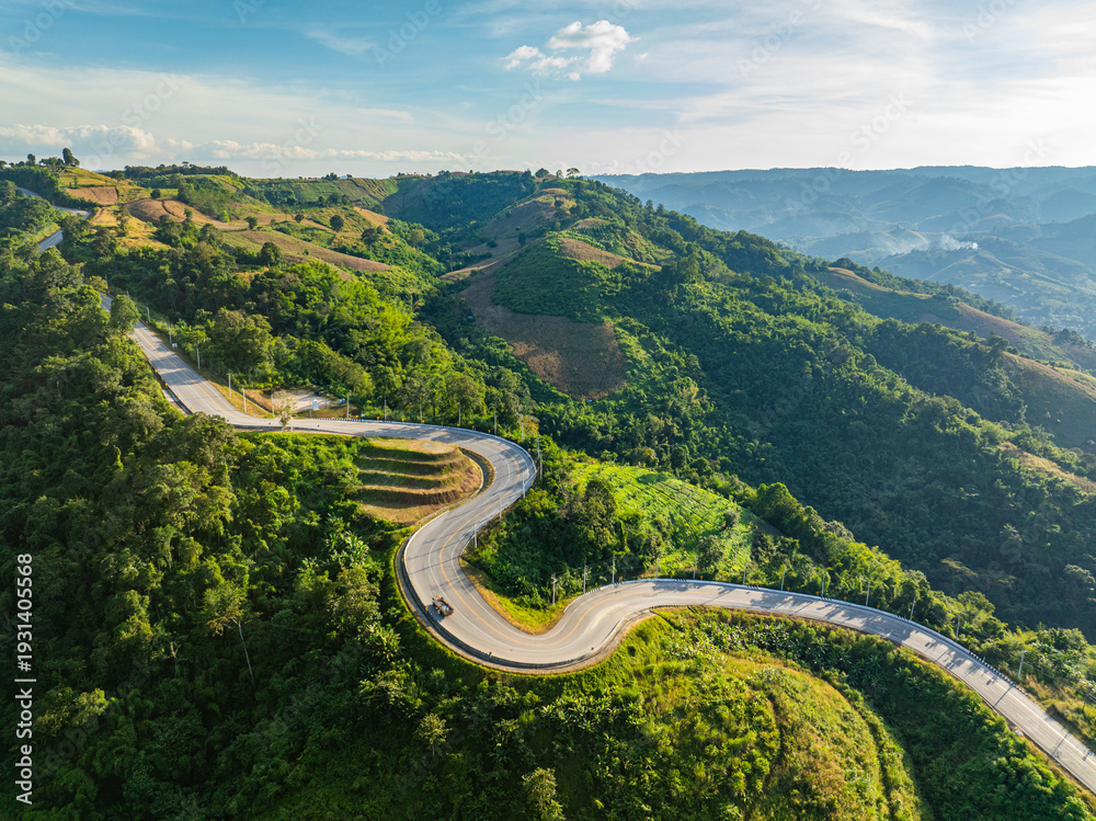 An aerial view of a winding mountain road weaving gracefully through lush green forests, highlighting the harmony between human engineering and untouched natural landscapes.