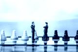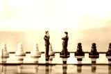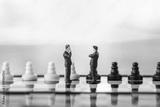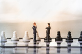 Business and Competition Concept. Businessman miniature figure standing on chessboard with black and white chess pieces