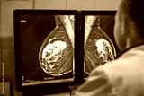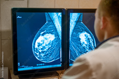 Doctor examines mammogram snapshot of breast of female patient on the monitors. Selective focus.