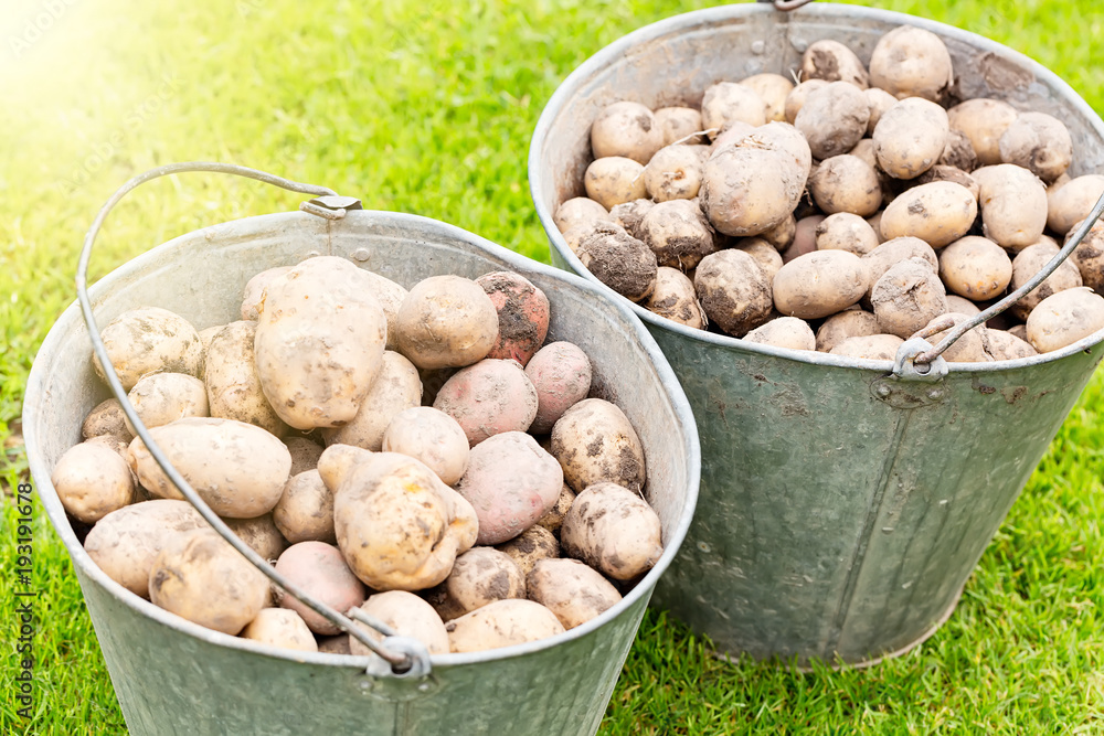 Farming and gardening concept. Potatoes in buckets in a row on green grass