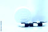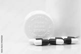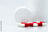 Capsules pills on white background and plastic bottle with blank label and copy space. Childproof packaging. Child resistant pill container. Push down and turn cap. Global healthcare concept.
