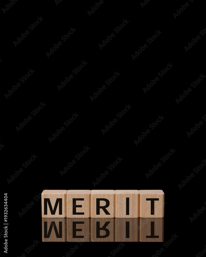 Wooden blocks forming the word "MERIT" with reflection on a black background.