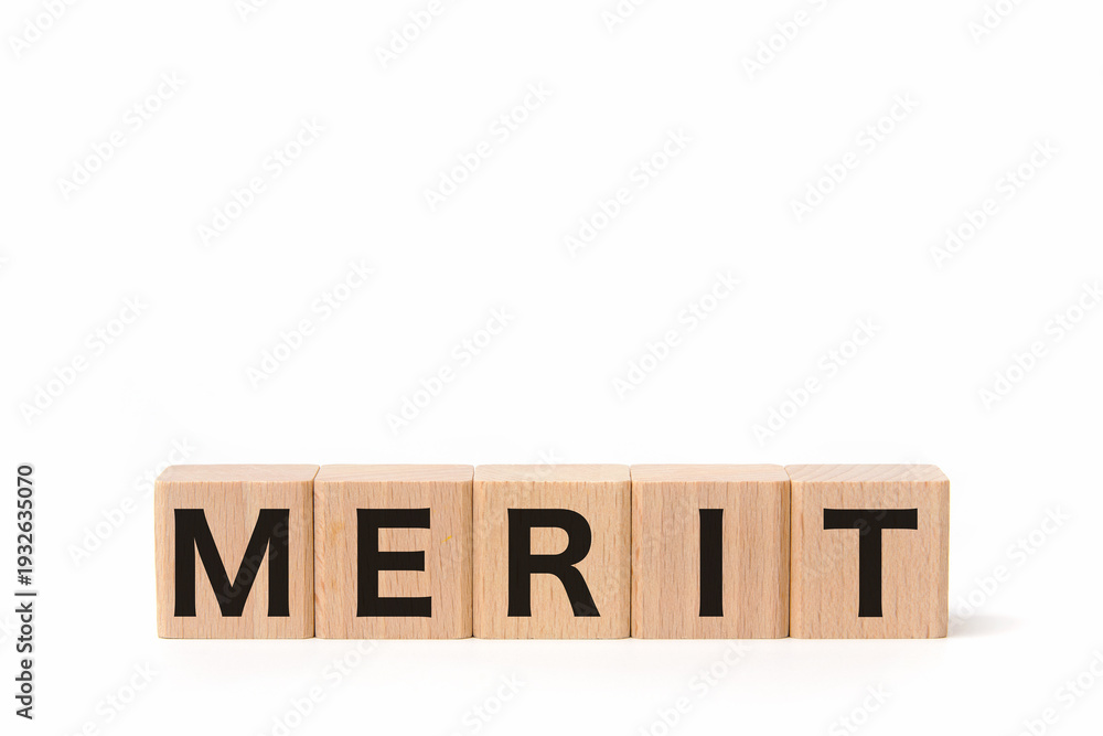 Wooden blocks forming the word "MERIT" on a clean white background.