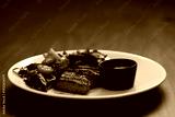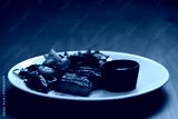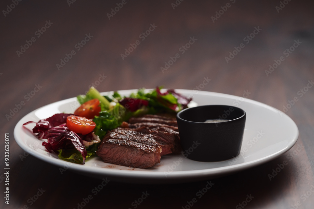 ribeye steak with garlic sauce and fresh salad on white plate on walnut table