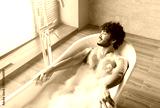A man sits in a bathtub filled with bubbles. Sunlight comes through the window, and the bathroom has a modern design with wooden floors. He appears to enjoy a moment of relaxation.