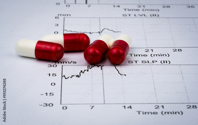 EKG or ECG (Electrocardiogram) graph report paper. EST ( Exercise Stress Test ) result and red-white capsule pills. Package promotion for heart check up in senior or elderly people concept.