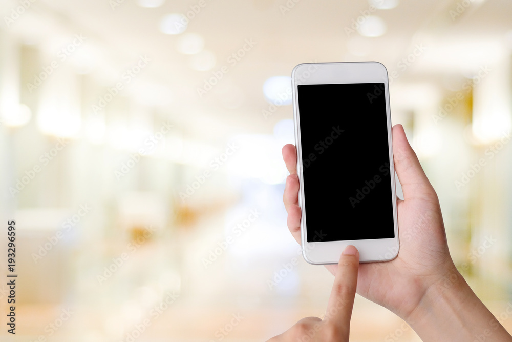 Hand using smart phone over blur bokeh light background, business and technology, internet of things concept