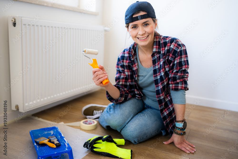 Woman sits on the floor while painting a room with a roller. Smiling and looking into camera, ready for painting renovation living room