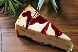 Delicious slice of raspberry cheesecake with berry sauce on top