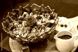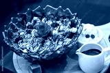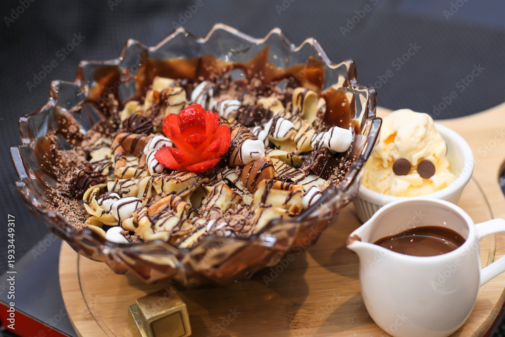 Delicious koko bowl dessert with strawberries and chocolate sauce served with ice cream