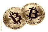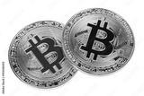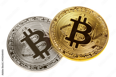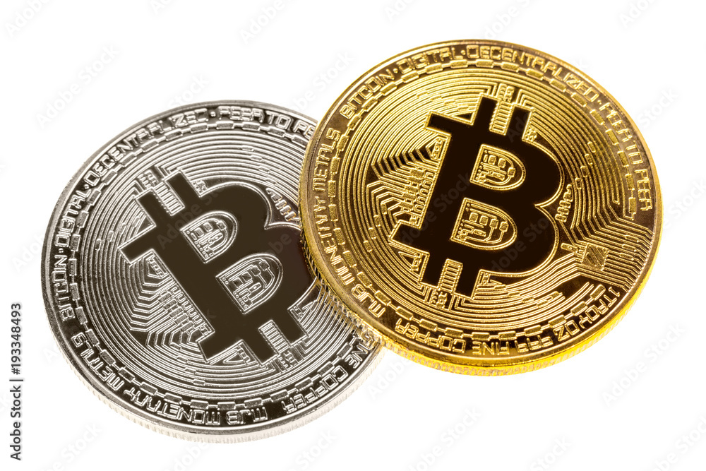 Silver and gold bitcoin coins isolated on white. Close up image. Electronic cryptography currency money exchange concept.
