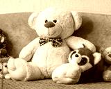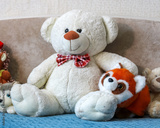 Childhood comfort concept with plush toy collection on bed, teddy bear and red panda in cozy bedroom interior, soft textures and safe home atmosphere