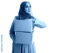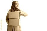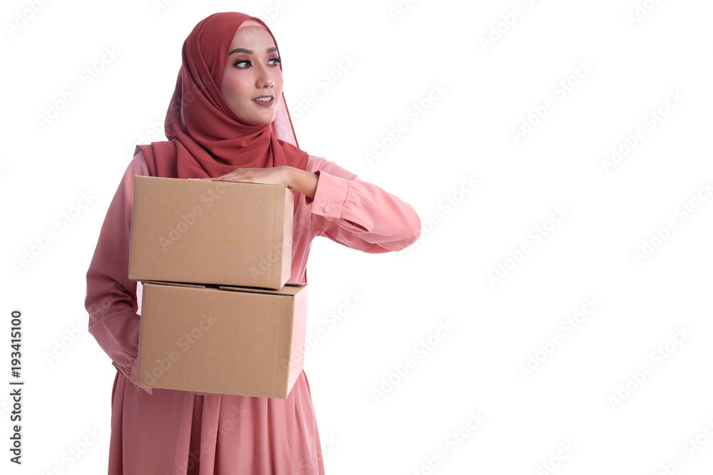 Muslim woman carrying boxes with white background. Delivering conceptual of online business