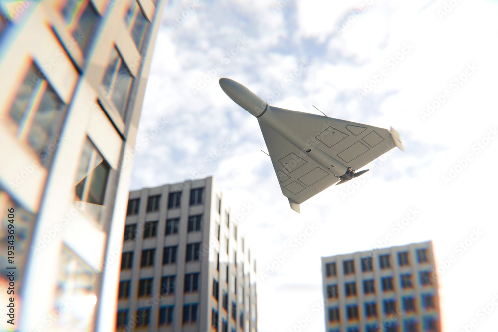 Dramatic bottom view of a delta-wing UAV soaring through a financial district. Represents the threat of loitering munitions in contemporary hybrid warfare scenarios