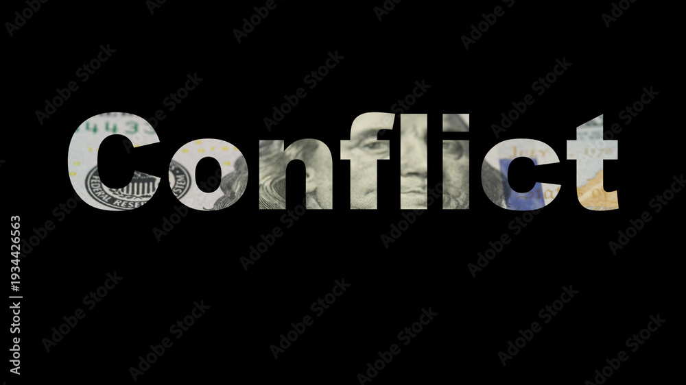 conflict economy background with one hundred dollar bills creative lettering design global crisis currency exchange and political tension concept of business, finance, international relations