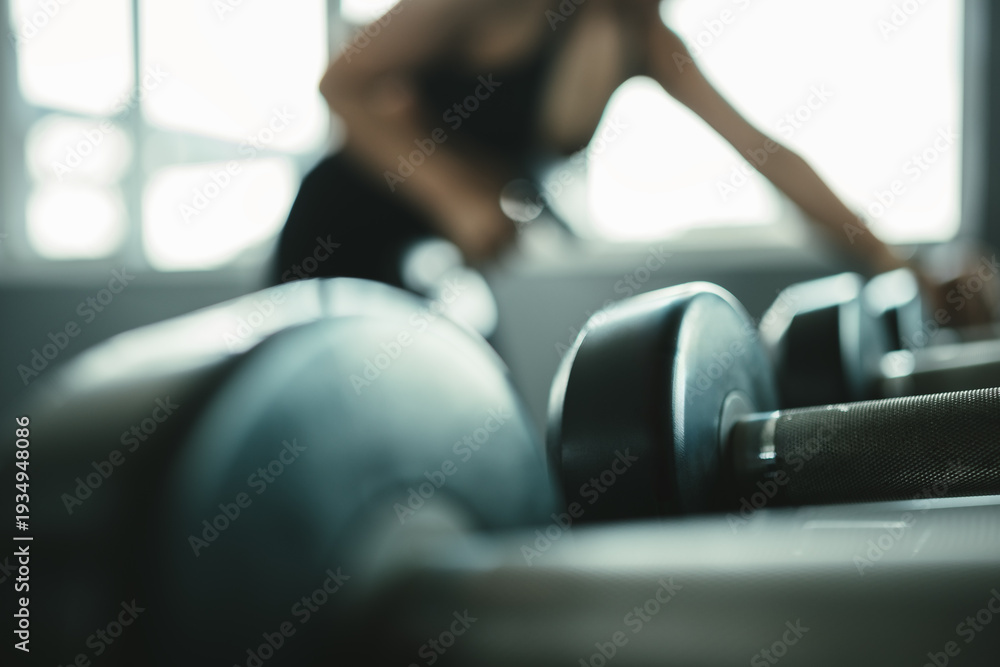 Close up dumbbells in modern gym with female athlete training in background, representing fitness lifestyle, strength training, motivation, and healthy active routine with copy space for banner design