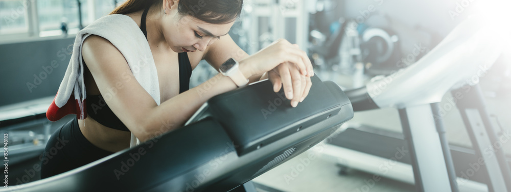 Female athlete leaning on treadmill in gym showing signs of burnout syndrome, mental exhaustion and workout fatigue, highlighting stress, emotional imbalance and mental health awareness in fitness.