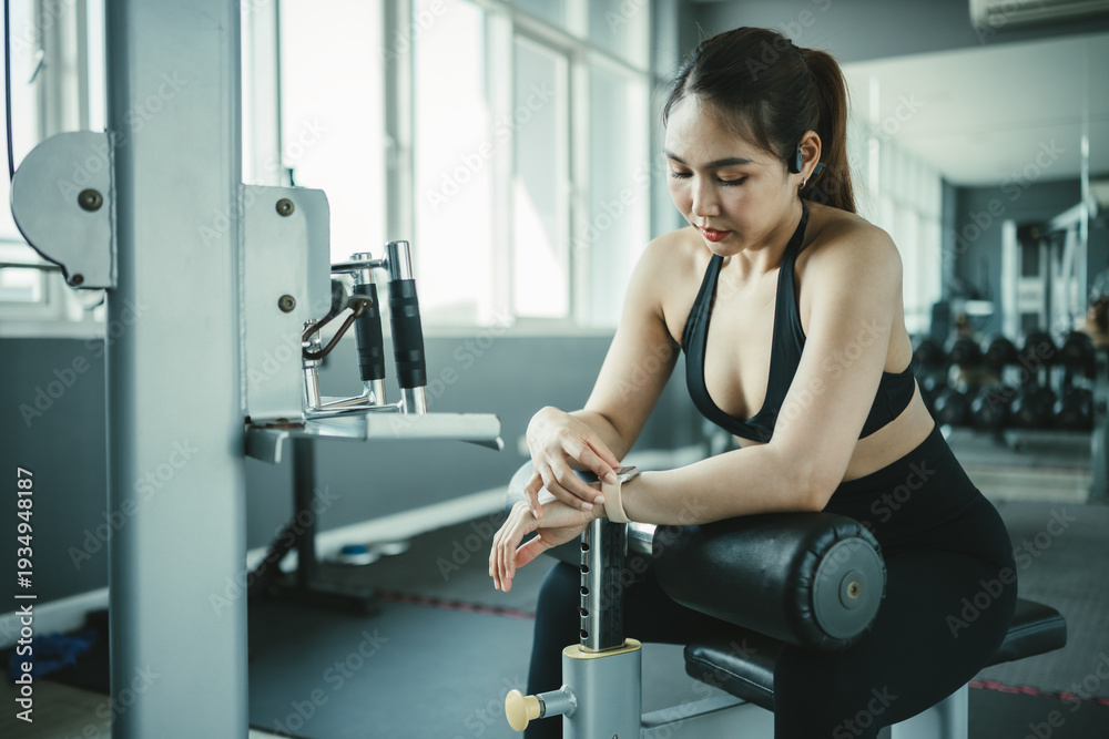 Female athlete resting during gym workout session, checking time and recovering energy, highlighting endurance, fatigue and balanced fitness lifestyle with active healthy routine in indoor training.