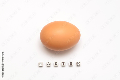 Chicken egg of light brown color on a white background with an Easter inscription from cubes
