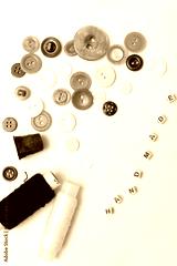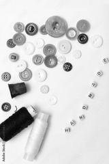 Buttons of different colors, scattered on a white background in the form of a circle with the inscription handmade