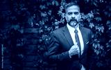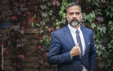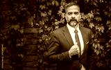 Fashionable senior business man posing on a wall covered with autumn foliage