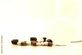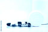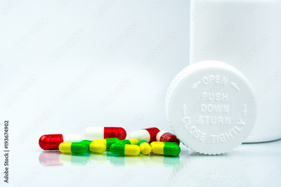 Colorful pills on white background and plastic bottle with blank label and copy space. Childproof packaging. Child resistant pill container. Push down and turn cap.Global healthcare concept.