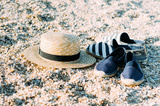 Straw hat and espadrilles lying on the sand on the beach. Summer concept. Holiday relaxing, beach vacation. Stylish accessories .
