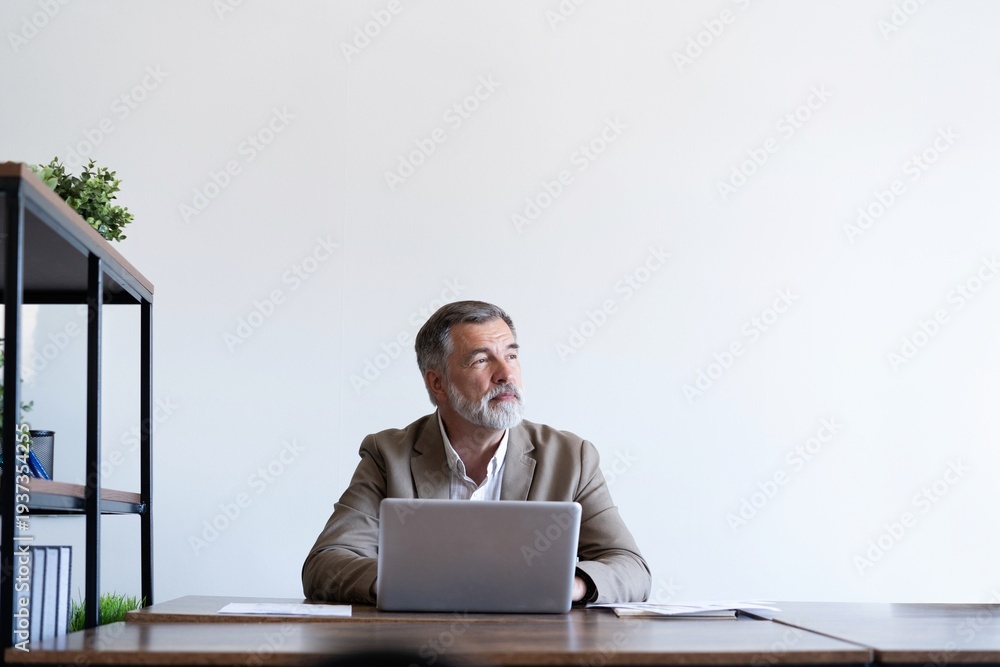 Portrait of mature man sitting at his desk in the modern office.