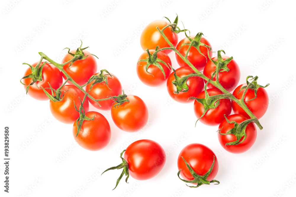 Fresh juicy red cherry tomato bunches closeup isolated on white background.