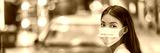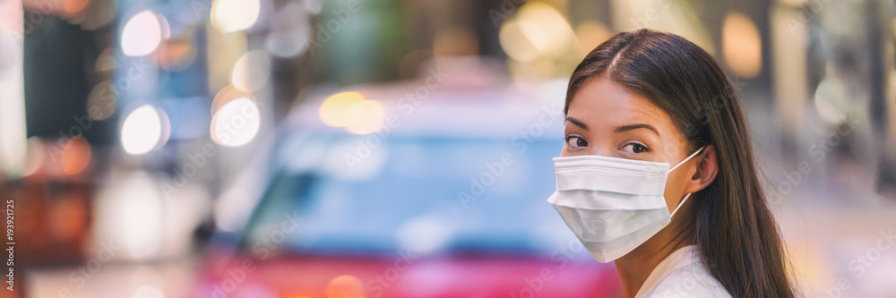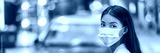 Flu virus protection mask protective against influenza sickness viruses and disease. Sick sian woman wearing surgical face mask in public spaces. Healthcare banner panorama concept.